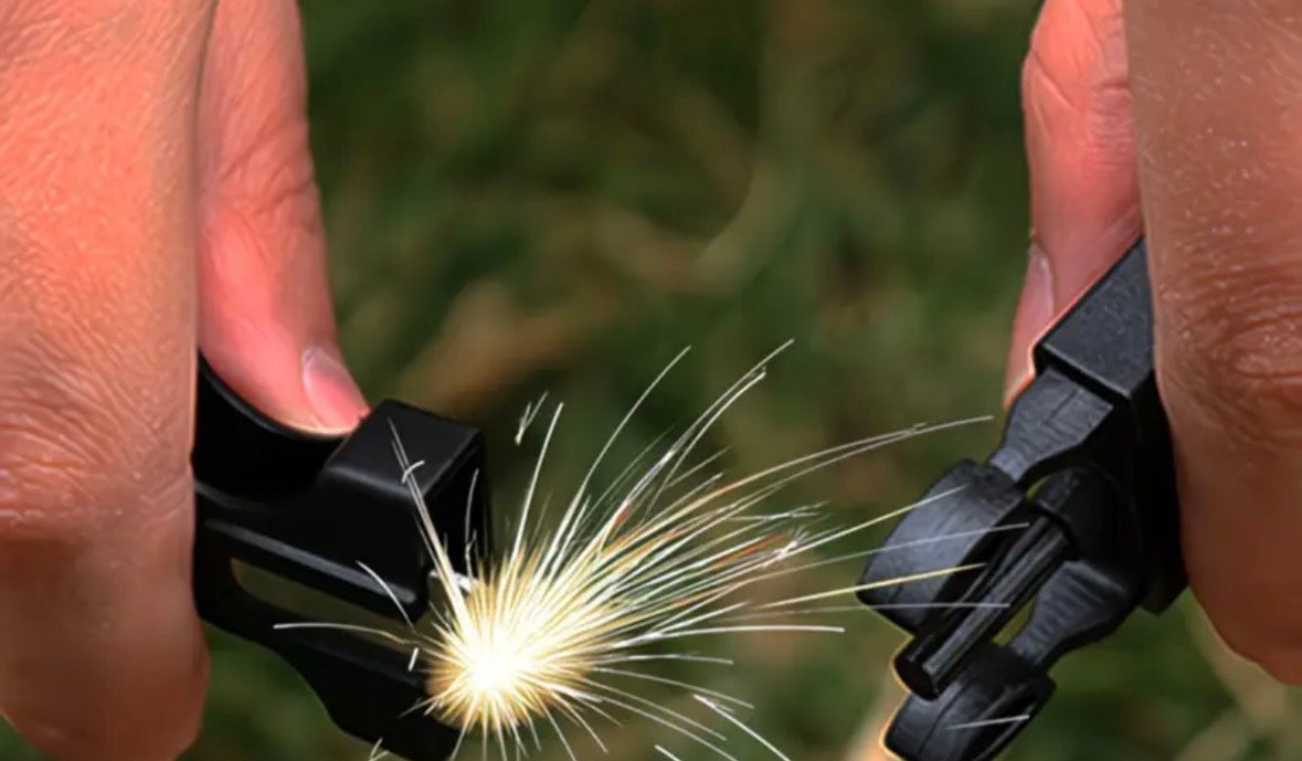 The buckle has a flint and steel for firemaking and a very basic edge for cutting.